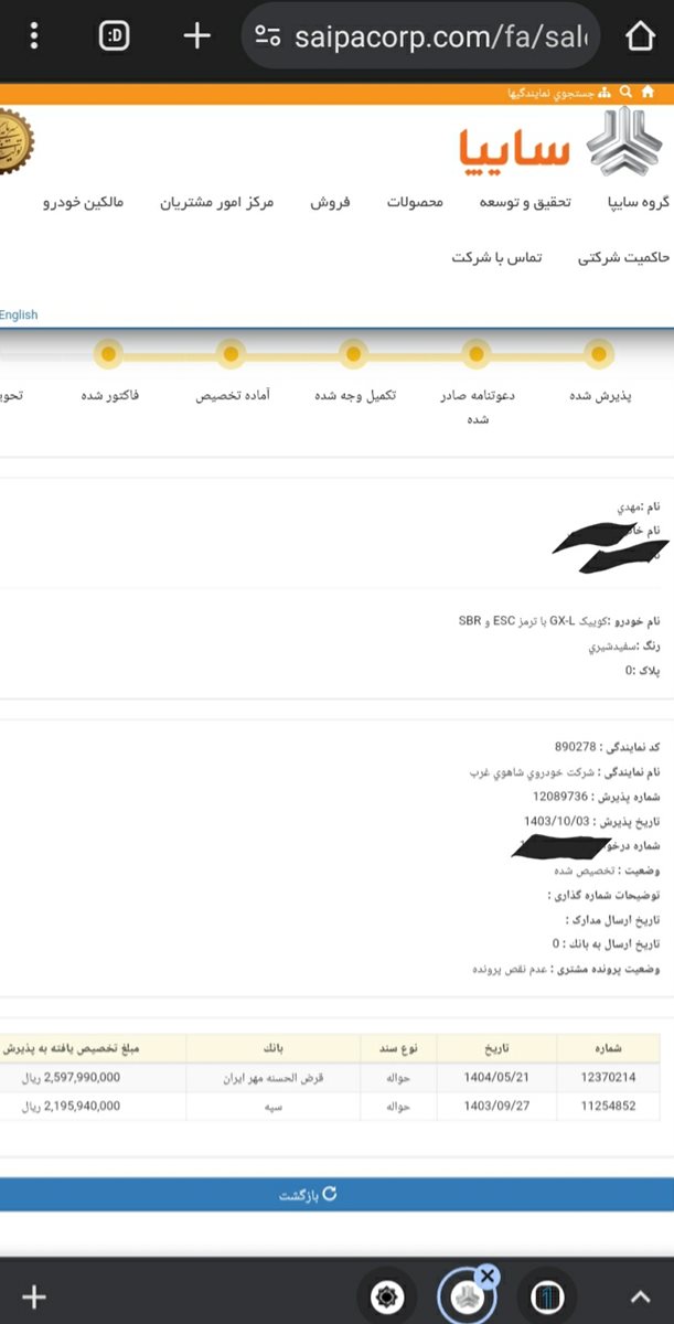 ساینا پیش فروش اسفند 403 : من حضوری رفتم شرکت سایپا من تکمیل وجه 3 مهر ماه هستم به من گفت اواسط بهمن فاکتور میشی