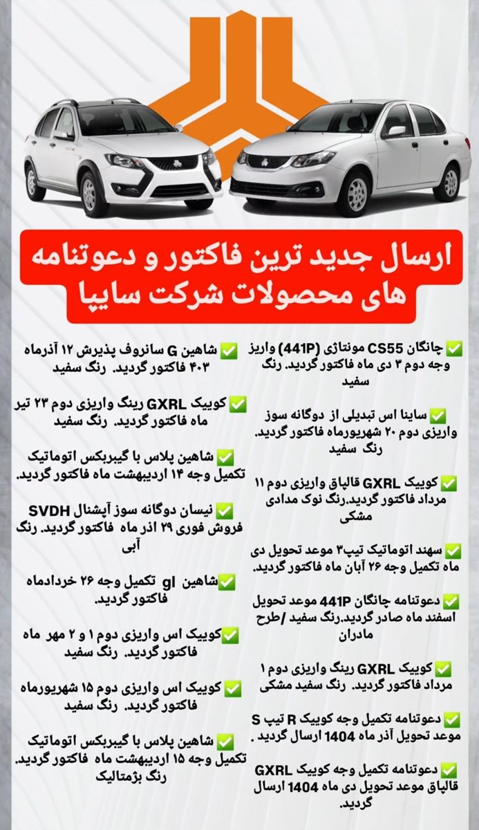 سلام ، من پنجشنبه حضورا رفتم سایپا ببینم کی میخوان تحویل بدن ، اول اینکه کاری از پیش نشد ببرم ، پرسیدم تا کی فاکتور شده رو سیستم دید گفت تا پنجم شهریور شده ، ضمنا بگم که ساینا تک نوشته بودم و همینو چک کرد