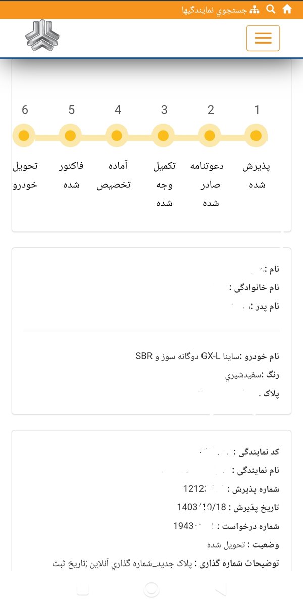 واریز اول 1403/10/17 واریزی دوم 1404/6/17 فاکتور در تاریخ 1404/8/27 همراه با SBR تحویل خود ماشین در تاریخ 1404/9/1 ساینا دوگانه ماشین خوبیه همه چیز مرتب واقعا ارزش صبر کردن داشت خدا رو شکر که تبدیل نزدم به ساینا تک