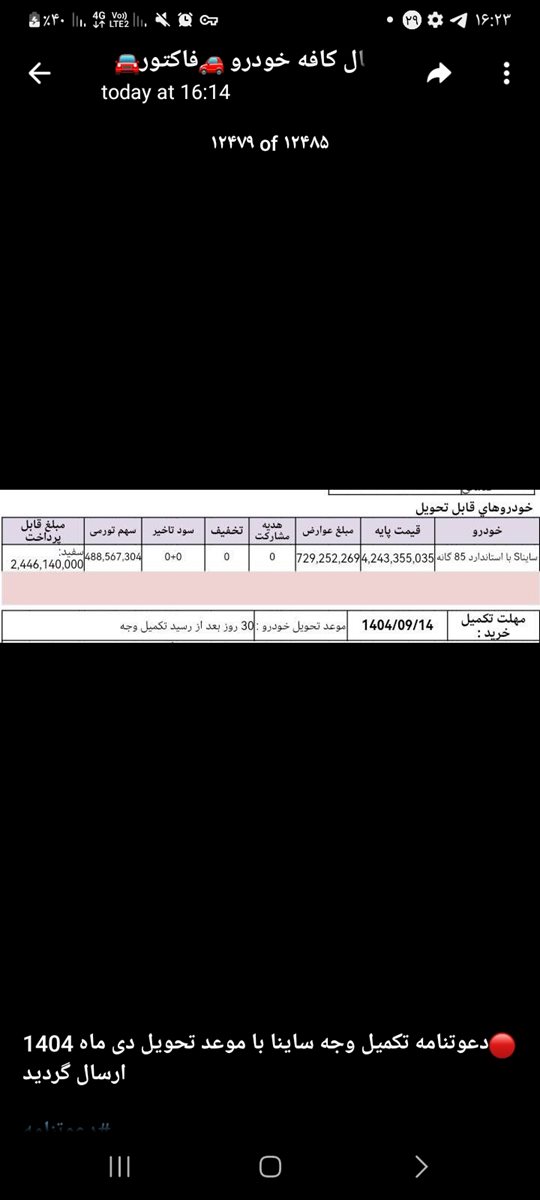 واریز اولی خودرو شاهین جی سی وی تی هفته چهارم اسفندماه 403 دعوتنامه تکمیل وجه نیومد تا اینکه دعوتنامه تکمیل وجه خرید 9 مهر 404 دعوتنامه تکمیل وجه شاهین جی سی وی تی اتوماتیک تبدیل خودرو قابل تحویل شاهین جی ال اومد 12 مهر 404 تکمیل خرید واریز دومی تا پایان 404 میشه 3 سال چشم انتظاری
