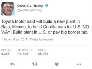 انگار ذنیای اقتصاد خبر ندارد . تویوتا هم جوابش این بود که ما نمی گذاریم سرمایه گذار در مکزیک،به تولید و تعداد نیروی انسانی مان در آمریکا لطمه ای بزند.