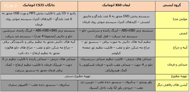 از جمله امکانات رفاهی مشترک بین لیفان X60 اتوماتیک و چانگان CS35 می توان به مواردی همچون تهویه مطبوع دمشی، سانروف، روکش چرمی صندلی ها، سیستم صوتی با 6 عدد بلندگو، سنسور دنده عقب و کنترلرهای سیستم صوتی روی فرمان اشاره کرد که در این بین برتری های X60 بر CS35، مواردی همچون DVD پلیر مجهز به مانیتور لمسی، سنسور نور دوربین دنده عقب و پاور ویندوز را شامل می شود.