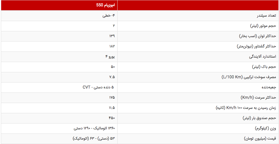 در ادامه میتوانید مشخصات فنی مهمترین رقبای امویام 550 را مشاهده کنید.