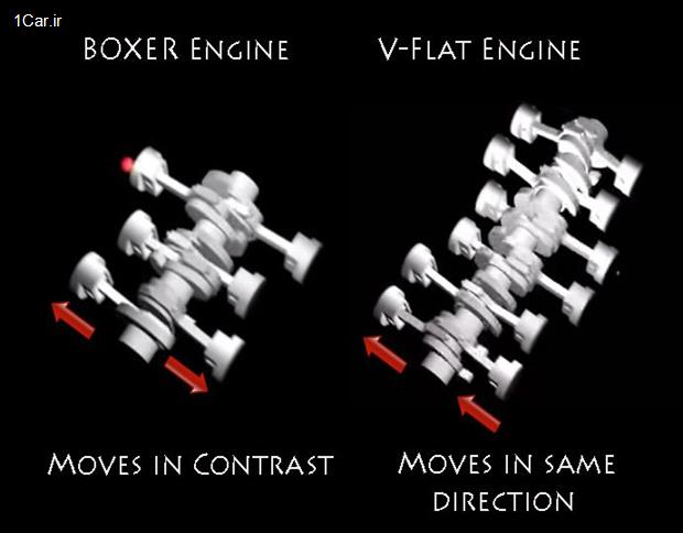 در تصویر سمت چپ شاهد یک پیکربندی V شکل تخت همانند نمونه بکار رفته در فراری برلینتا بوکسور هستید درحالیکه تصویر سمت راستی یک طراحی بوکسوری کامل را با یاتاقانهای جدا برای پیستون نشان میدهد.