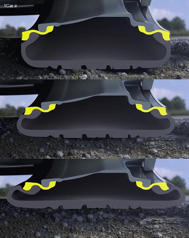 توضیح عکس: در هنگام حرکت بر روی یک حفره، بازوها نسبت به فشاری که به تایر وارد میشود، تغییر شکل اندکی دارند، امّا همین موضوع باعث میشود که از فشار سخت به دیواره تایرها و پارگی بافت داخلی آنها جلوگیری گردد.