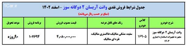 به اطلاع عموم متقاضيان محترم و نمايندگيهاي مجاز ميرساند، شركت ايران خودرو در راستاي ايجاد امكان ثبت نام در نمايندگي و عرضه خودرو به مصرف كنندگان واقعي طرح فروش نقدي خودروي وانت آريسان 2 دوگانه سوز ، مجهز به تجهيزات استاندارد اجباري 1403 با موعد تحويل حداكثر 90 روزه را با شرايط جدول ذيل ارائه مي نمايد:
