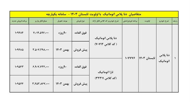 به اطلاع نمایندگی های محترم میرساند شرایط انتخاب و واریز وجه به تعداد محدود برای متقاضیان خودرو دنا پلاس اتوماتیک و دستی با اولویت های تابستان 1403 سامانه یکپارچه، مطابق جدول ذیل ایجاد شده است.