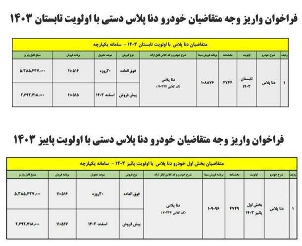 شرايط انتخاب و واريز وجه مجدد براي براي بخش اول متقاضيان خودروي دنا پلاس (6 سرعته دستی) با اولويت تابستان و پائيز سال جاري سامانه يكپارچه، مطابق جدول فوق ايجاد شده است. متقاضيان فوق مي‌توانند طی مدت 10 روز با مراجعه به سايت فروش اينترنتي به آدرس esale.ikco.ir نسبت به واريز وجه اقدام نمايند.
