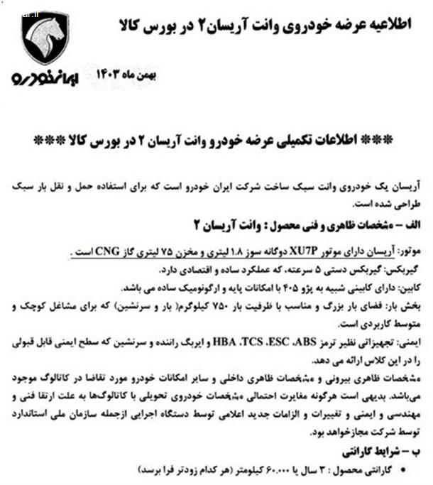 به این ترتیب در روز اول اسفند ۲۰۰ دستگاه وانت آریسان ۲ گروه صنعتی ایران خودرو با قیمت پایه ۳۹۲ میلیون و ۵۵۰ هزار تومان و تحویل اول خرداد ۱۴۰۴ در تالار خودرو عرضه می شود.