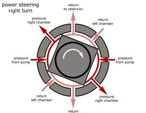 توان هیدرولیکی لازم برای گرداندن فرمان، توسط یک پمپ با پروانه های گردان که همگی درون محفظهای بیضی شکل می چرخند، تامین می شود. این پمپ توسط پیشرانه خودرو و به واسطه یک تسمه و پولی به حرکت در می آید. پروانه ها با حرکت خود، مایع هیدرولیک کم فشار را از شیلنگ بازگشت می کشند و با فشار از خروجی به صورت پر فشار به خارج می رانند. شدت جریان مایع به سرعت پیشرانه خودرو بستگی دارد.
