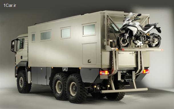 گفتنی است، این غول 18 تنی سوار بر شاسی کمپانی MAN می‌باشد و از آنجایی که این زیبای بزرگ از قابلیت مانور بسیار کمی برخوردار است، برای گشت و گذار در مناطق مختلف، موتورسیکلتی در قسمت پشتی آن تعبیه شده است. از دیگر تجهیزات این خودرو می‌توان اشاره ای به سیستم کنترل آب و هوای اتوماتیک، کف پوش سنگی، پنل بسیار پیچیده، میز، نورپردازی با چراغ LED و طراحی داخلی فلزی داشت.