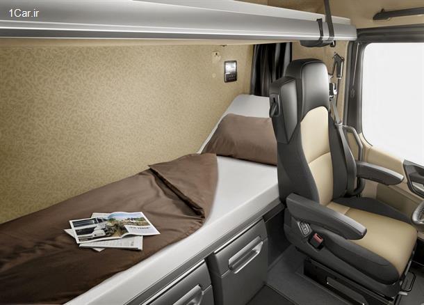 بنز اکتروس مدلی است که جایزه بهترین کامیون سال 2012 را از آن خود کرده است. پیش از این نیز در 1Car به بررسی این کشنده آلمانی در هفت بخش پرداخته بودیم. کامیون اکتروس اکتروس MP4 بیش تر از یک سال است که به بازار آمده و در جاده ها به خوبی شناخته شده است. همانطور که در نام این تیپ آمده است، این کشنده دارای کابین بزرگتری نسبت به دو تیپ سایز متوسط است. طراحی خاص آیرودینامیک این اکتروس باعث شده که فضای کمد های بالایی کم شود. یکی از نکات بسیار مثبت اکتروس، نحوه قرارگیری دو کشوی تعبیه شده در زیر تخت است. هریک از این کشوها درست همانند کشوهای کشنده داف فضای کافی برای جاگیری یک چمدان بزرگ را دارند. لازم به ذکر است، در کنار این کشوها نیز یک یخچال کاربردی و جادار قرار گرفته است.