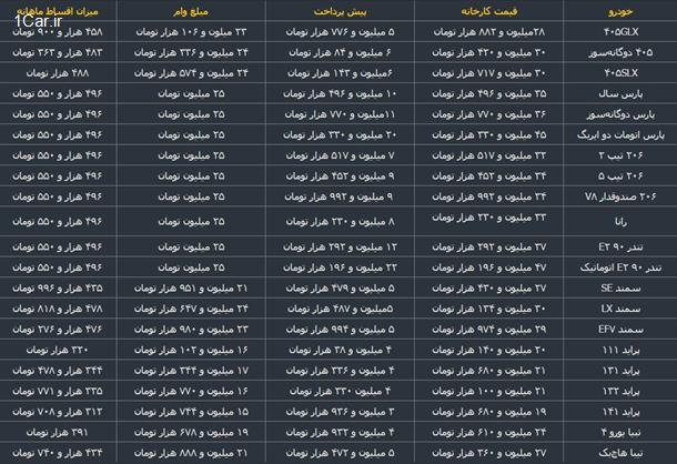 همچنین هر دستگاه پژو ۲۰۶ تیپ ۲ در بازار ۳۲ میلیون و ۵۱۷ هزار تومان، پژو ۲۰۶ تیپ ۵ در بازار ۳۴میلیون و ۴۵۲ هزار تومان، پژو ۲۰۶ صندوقدار V۸ معادل ۳۴ میلیون و ۹۹۲ هزار تومان، رانا ۳۳میلیون و ۲۳۳ هزار تومان، تندر ۹۰ ای۲ معادل ۳۷میلیون و ۲۹۲هزار تومان، تندر ۹۰ اتومات ای۲ معادل ۴۷ میلیون و ۱۹۶ هزار تومان، سمند SE معادل ۲۷میلیون و ۴۳۰ هزار تومان، سمند LXمعادل ۲۹ میلیون و ۸۰۰ هزار تومان و سمند EF۷ نیز ۲۹میلیون و ۹۷۳ هزار تومان است.